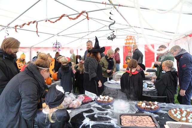 Hos Lotte samles naboerne i et telt på et fællesområde, hvor der er opsatte borde med plads til græskarudskæring og andre kreative sysler med edderkopper, flagermus og spøgelser, som børn sætter op i træerne.